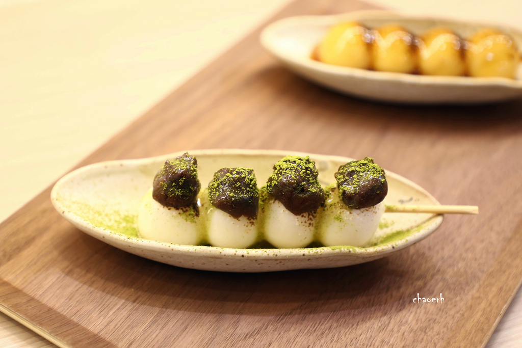 抹茶紅豆~白玉糰子上滿滿的蜜漬紅豆,再撒上抹茶粉提味