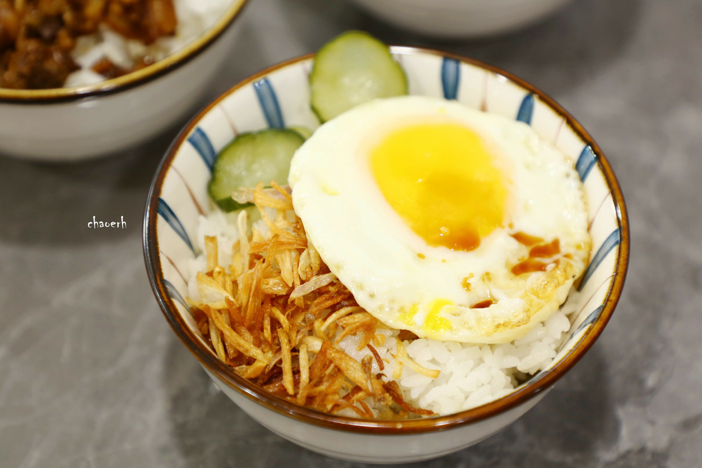 上頭有太陽蛋、油蔥酥、醃漬小黃瓜,添加豬油讓白飯更香